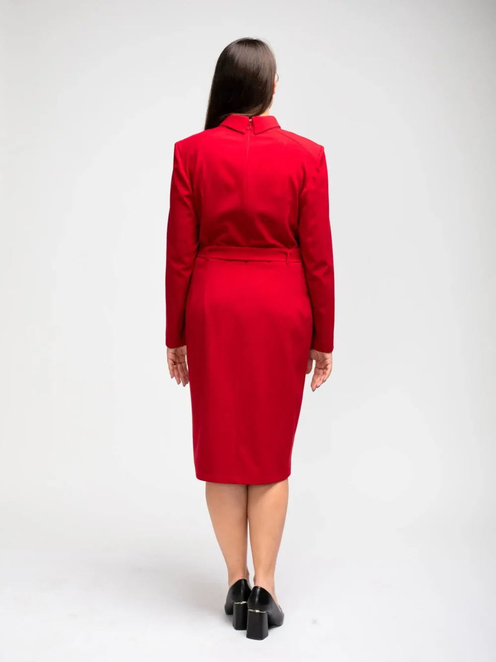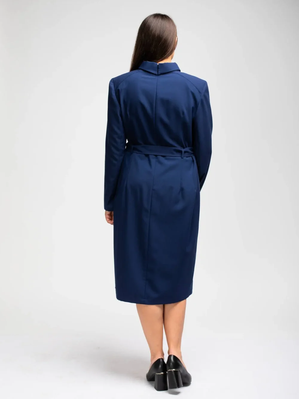 Ilgos rankovės, tvarkinga apykaklė, paslėptas užtrauktukas nugaroje ir juosmenį pabrėžiantis dirželis kuria subtilią, išbaigtą išvaizdą, o pamušalas sijono dalyje užtikrina patogumą ir gražų kritimą.